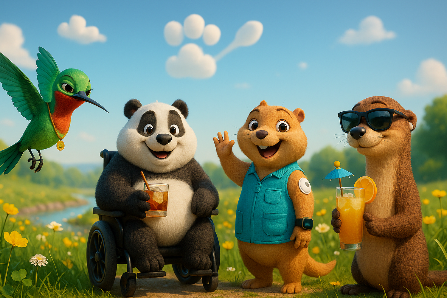 In het midden rolt Bumbly “The Procasti-Panda”—een relaxte panda in zijn Nimbus/Permobil-achtige elektrische rolstoel, half gadgetnerd, half chaosmagneet. Zijn superkracht is niet snelheid of kracht. Het is diep luisteren en een koppige vorm van optimisme die zegt: “Oké… wat is de workaround?” Hij verzamelt kleine overwinningen als souvenirs: een helling op het juiste moment neergezet, een kaart vol veilige routes, een drankje precies goed gekanteld met een rietje—mini-keuzes die een moeilijke wereld begaanbaar maken.
